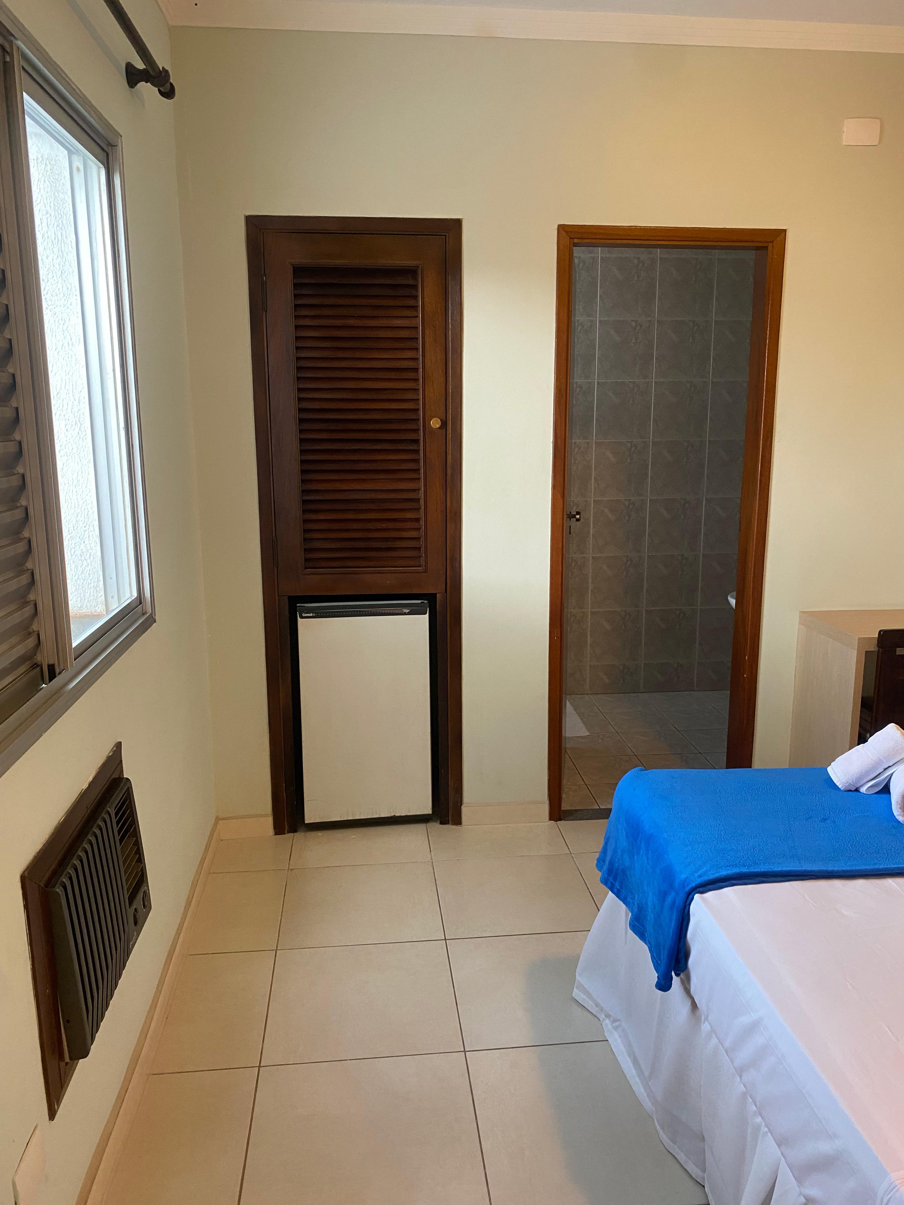 Contém ar condicionado, banheiro privativo com amenidades de banho (sabonete líquido e shampoo/condicionador 2x1), mesa de trabalho, frigobar abastecido, cesta de snacks. TV com acesso a programação NET - canais a cabo. Luzes de leitura na cabeceira, tomadas para recarregar seus equipamentos.